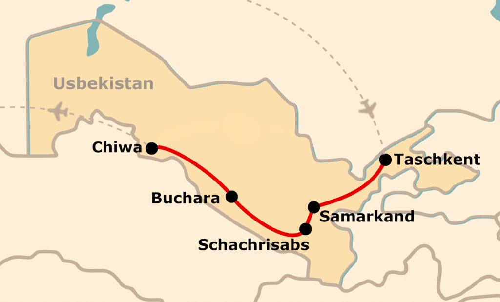 Der im folgenden beschriebene ist nur einer von vielen möglichen Reiseabläufen. Wenn Sie Änderungswünsche haben – am besten anrufen oder eine E-mail schicken, damit Doris Knop eine haargenau auf Ihre Wünsche zugeschnittene Reise durch Usbekistan für Sie zusammenstellen kann.