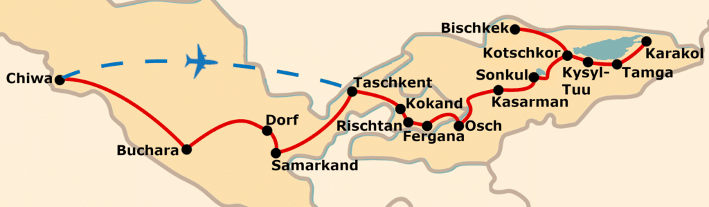 - Durchgehende deutschsprachige einheimische Reisebegleitung (eine in Kirgistan und eine in Usbekistan)