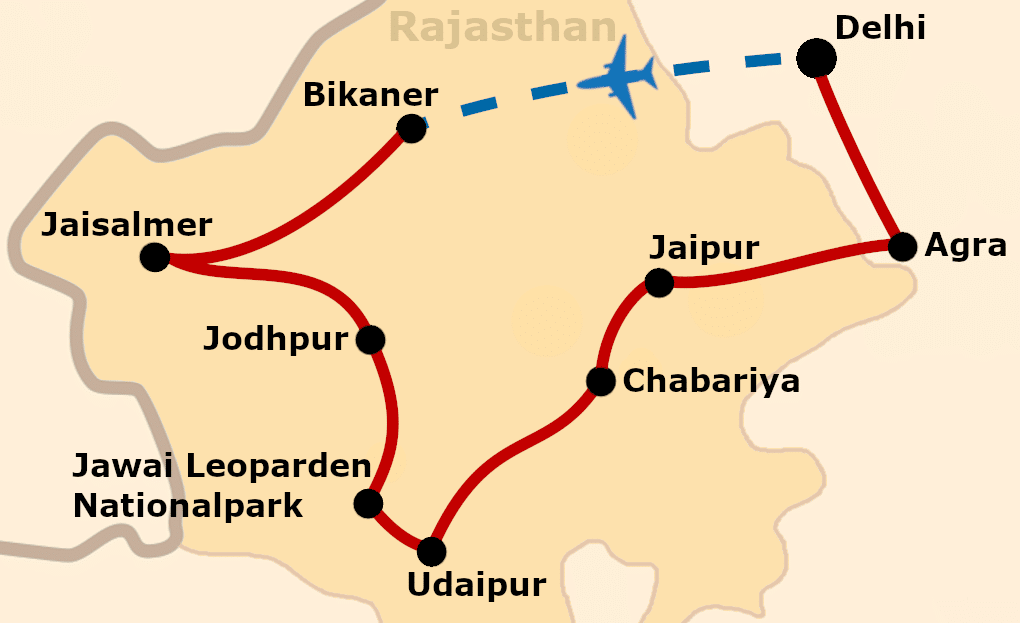 Rajasthan, das „Land der Könige“, ist Indiens flächenmäßig größter Bundesstaat und fast so groß wie Deutschland. Trotz rund 70 Millionen Einwohnern ist er mit 200 Menschen pro Quadratkilometer vergleichsweise dünn besiedelt, nur ein Viertel lebt in Städten. Die Alphabetisierungsrate ist niedrig, nur 66 % können lesen und schreiben. Hindi ist Amtssprache, 89 % sind Hindus, gefolgt von Muslimen, Sikhs und Jainas. Rajasthan begeistert mit prachtvollen Palästen, Tempeln und Festungen, die an die Glanzzeit der Maharadschas erinnern. Farbenfrohe Märkte, kulinarische Genüsse und die Gastfreundschaft der Menschen machen den Reiz dieser Region aus. Nirgends ist Indien so bunt, exotisch und kontrastreich wie hier – Rajasthan verkörpert das märchenhafte Indien in seiner schönsten Form.