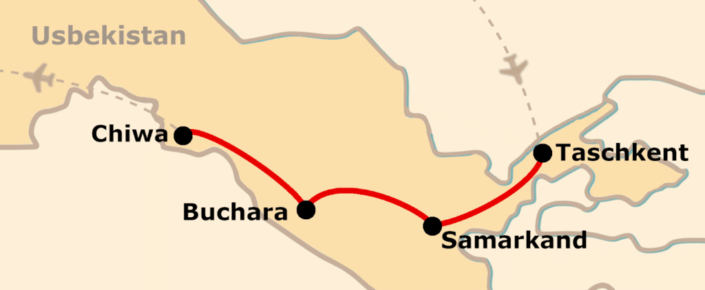 ich wollte Ihnen noch eine Rückmeldung über die Usbekistanreise geben: Es war eine wunderschöne, super organisierte Reise. Besonders die Reiseleitung und die Auswahl der Unterkünfte haben uns begeistert. Taschkent war eine tolle Stadt, die uns sehr gut gefallen hat. Die Reiseführerin Helena hatte sehr viel Wissen und konnte alles anschaulich und spannend erzählen – ihre Deutschkenntnisse waren hervorragend.